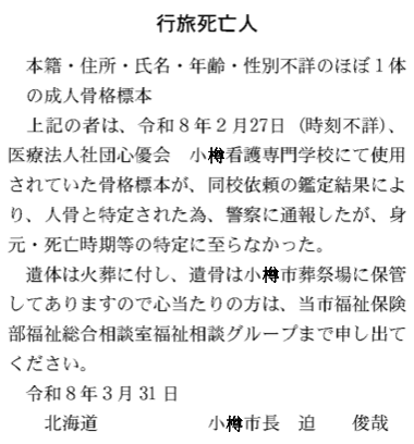 上記の者は、令和8年2月27日(時刻不詳)、医療法人社団心優会小樽看護専門学校にて使用されていた骨格標本が、同校依頼の鑑定結果により、人骨と特定された為、警察に通報したが、身元死亡時期等の特定に至らなかった。遺体は火葬に付し、遺骨は小樽市葬祭場に保管してありますので心当たりの方は、当市福祉保険部福祉総合相談室福祉相談グループまで申し出てください。