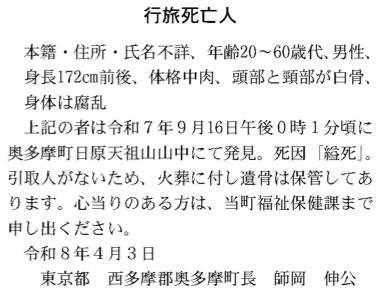 行旅死亡人本籍・住所・氏名不詳、年齢20~60歳代、男性、身長172cm前後、体格中肉、頭部と頸部が白骨、身体は腐乱上記の者は令和7年9月16日午後0時1分頃に奥多摩町日原天祖山山中にて発見。死因「縊死」。引取人がないため、火葬に付し遺骨は保管してあります。心当りのある方は、当町福祉保健課まで申し出ください。