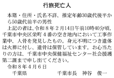 上記の者は、令和8年2月14日午前10時40分頃、千葉市中央区栄町4番の空き地内において工事作業中、人骨を発見したもの。身元不明につき遺体は火葬に付し、遺骨は保管しています。お心当たりの方は、千葉市中央保健福祉センター社会援護第二課まで申し出てください。