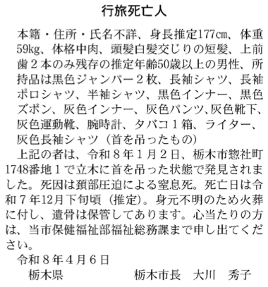 上記の者は、令和8年1月2日、栃木市惣社町1748番地1で立木に首を吊った状態で発見されました。死因は頚部圧迫による窒息死。死亡日は令和7年12月下旬頃(推定)。身元不明のため火葬に付し、遺骨は保管してあります。心当たりの方は、当市保健福祉部福祉総務課まで申し出てください。