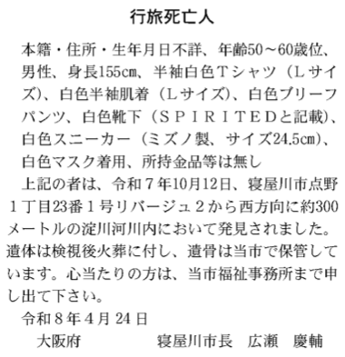 上記の者は、令和7年10月12日、寝屋川市点野1丁目23番1号リバージュ2から西方向に約300メートルの淀川河川内において発見されました。遺体は検視後火葬に付し、遺骨は当市で保管しています。心当たりの方は、当市福祉事務所まで申し出て下さい。