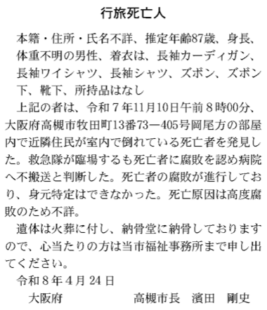上記の者は、令和7年11月10日午前8時00分、大阪府高槻市牧田町13番73-405号岡尾方の部屋内で近隣住民が室内で倒れている死亡者を発見した。救急隊が臨場するも死亡者に腐敗を認め病院へ不搬送と判断した。死亡者の腐敗が進行しており、身元特定はできなかった。死亡原因は高度腐敗のため不詳。