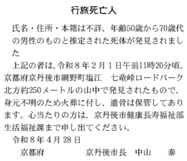 上記の者は、令和8年2月1日午前11時20分頃、京都府京丹後市網野町塩江七竜峠ロードパーク北方約250メートルの山中で発見されたもので、身元不明のため火葬に付し、遺骨は保管してあります。心当たりの方は、京丹後市健康長寿福祉部生活福祉課まで申し出てください。
